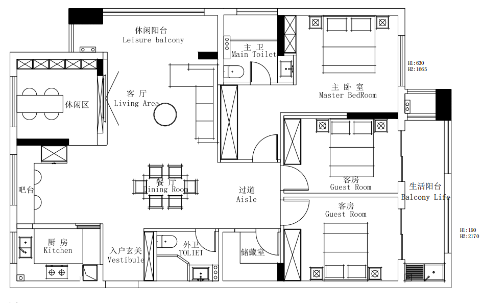 与方案一的区别在于在原来餐厅位置增加的吧台,冰箱放到了外面,餐桌放在了客厅旁边,其他空间设计与原方案差不多