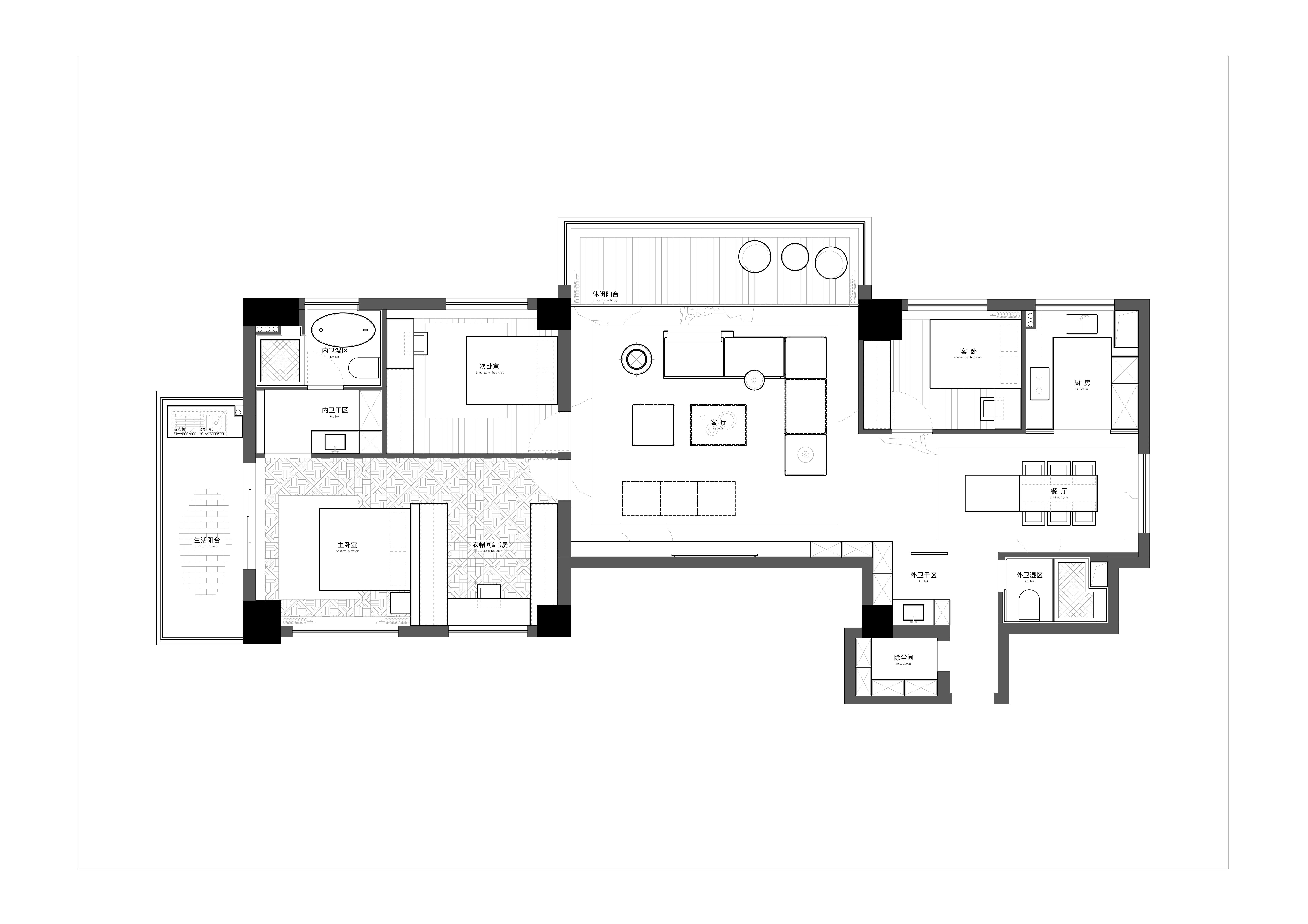 调整客卧位置,让出原本卧室位置做餐厅,厨房朝向调整,构成整体连贯且开阔的公共休闲空间,南面两个采光最好的房间做主次卧使用,北面房间改做主卧衣帽间,动线上先从衣帽间进入再进主卧空间,使动线更合理,
